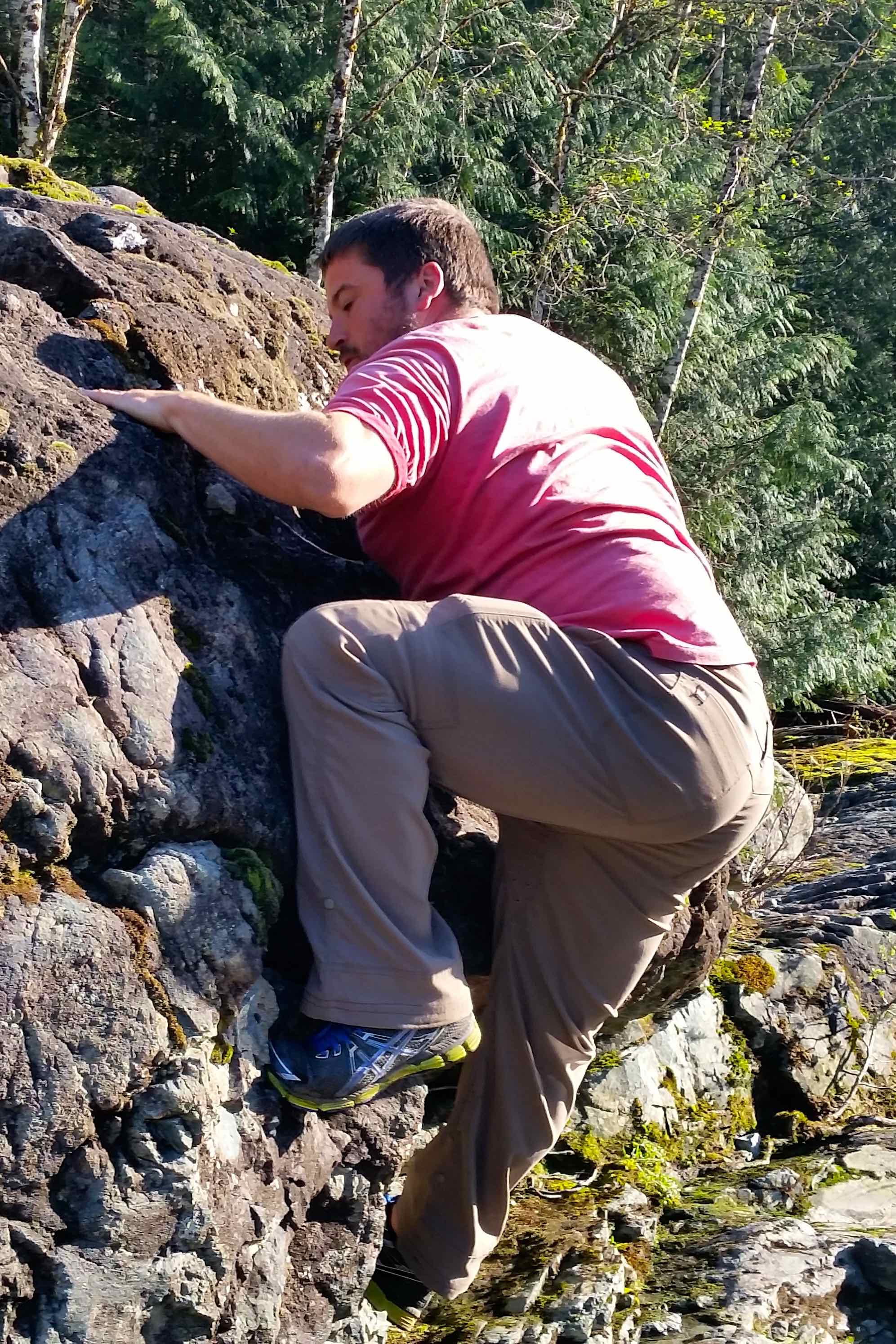 KC climbing on the rock in the riverbed