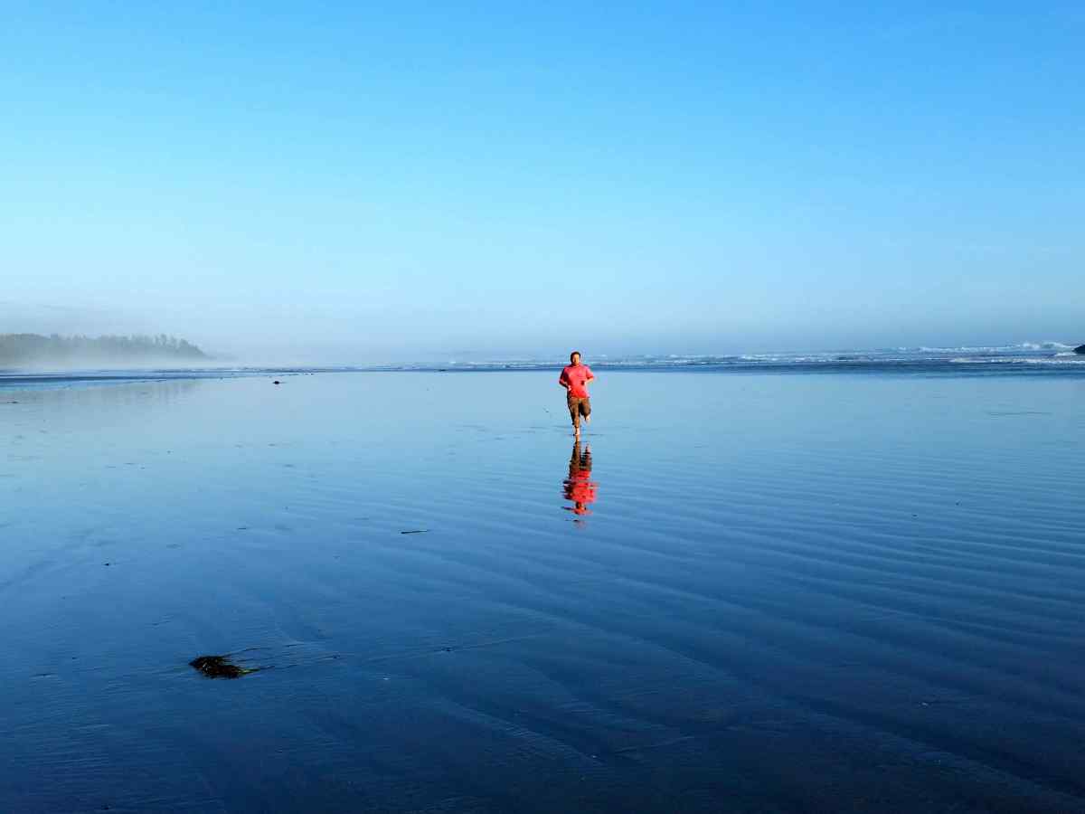 I’m not sure what tide it was, but the water in this area was pretty shallow and was creating some great reflected images. KC had run out to touch an island, where there was a small, hard to see, land bridge. Waves broke to either side of him. This is just an artsy picture of him running back from the island.