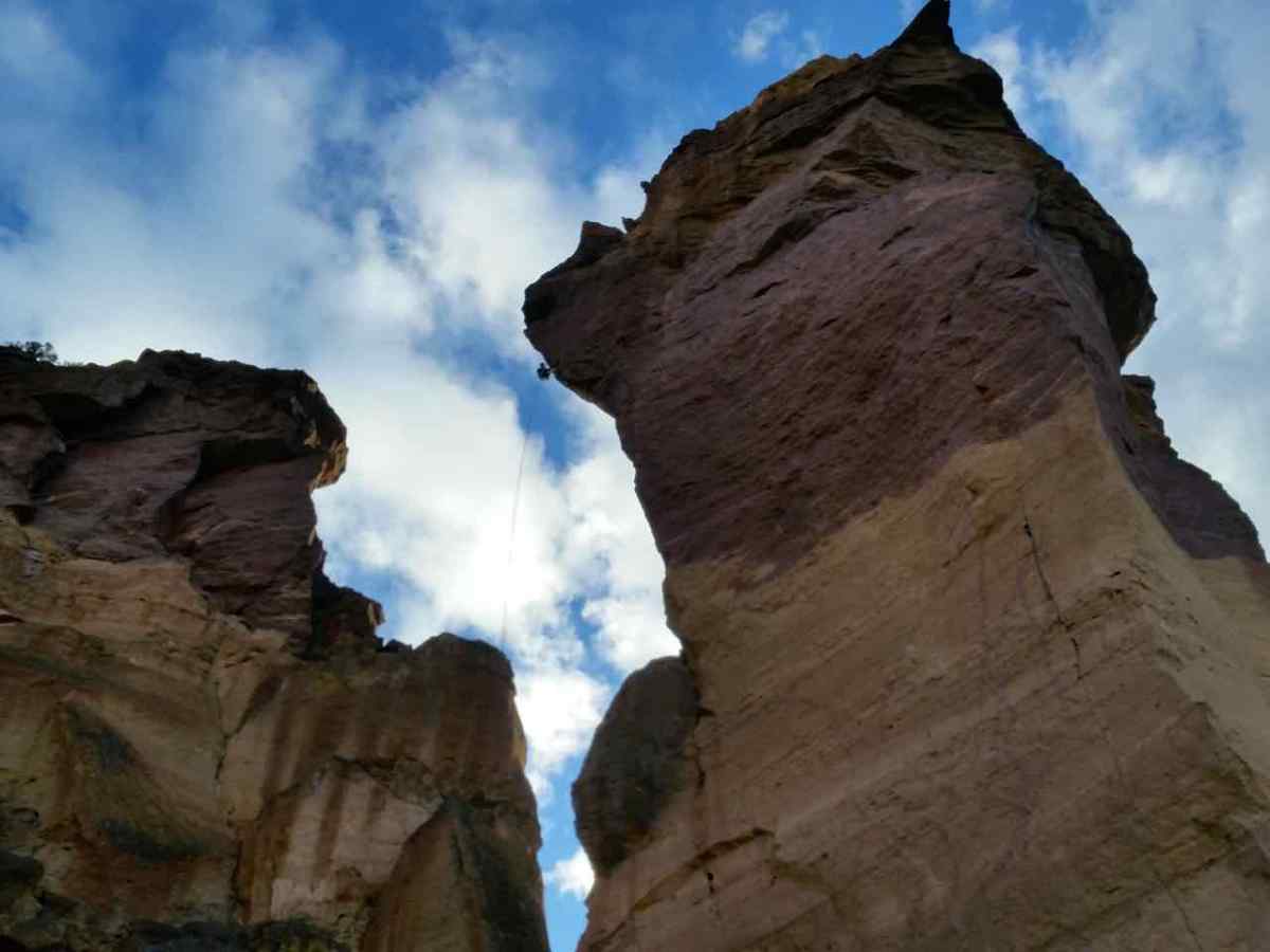 This is a four pitch climb (not sure the rating) up to the top. Lots of single pitch climbs at the bottom. We were lucky enough to see a team of four climbers rappel from the top to the bottom. If you look closely, you can see one of the climbers near the left side of the formation.