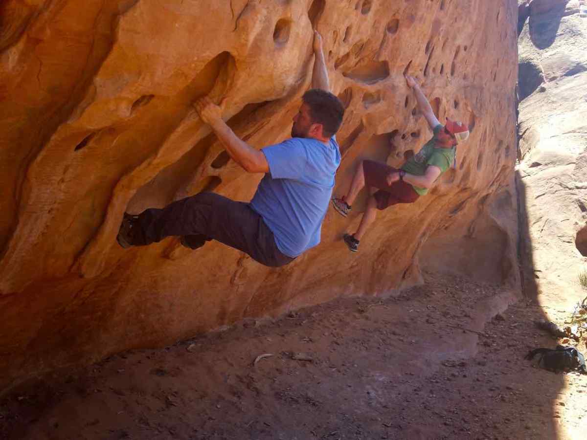 Bouldering Behind the Navajo Arch Published June 10, 2015 at 1280 × 960 in A Desert Wonderland – Hiking Around Arches National Park ← Previous Next → Impromptu bouldering behind the Navajo Arch in Arches National Park We weren’t sure if we could climb on the rock in this area, but the holds were too good to pass up.