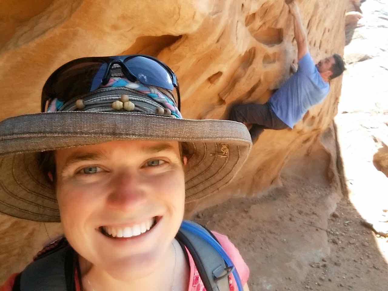 KC Bouldering in the Background Published June 10, 2015 at 1280 × 960 in A Desert Wonderland – Hiking Around Arches National Park ← Previous Next → A selfie with the hubby climbing in the background