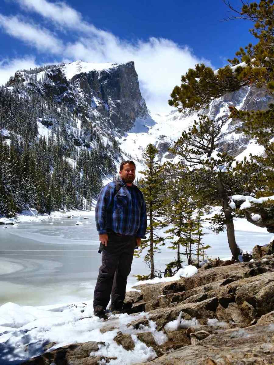 KC at Emerald Lake Published July 12, 2015 at 960 × 1280 in Snow and Elk on the Trails – Rocky Mountains National Park ← Previous Next → KC at the Emerald Lake with Hallett Peak behind him