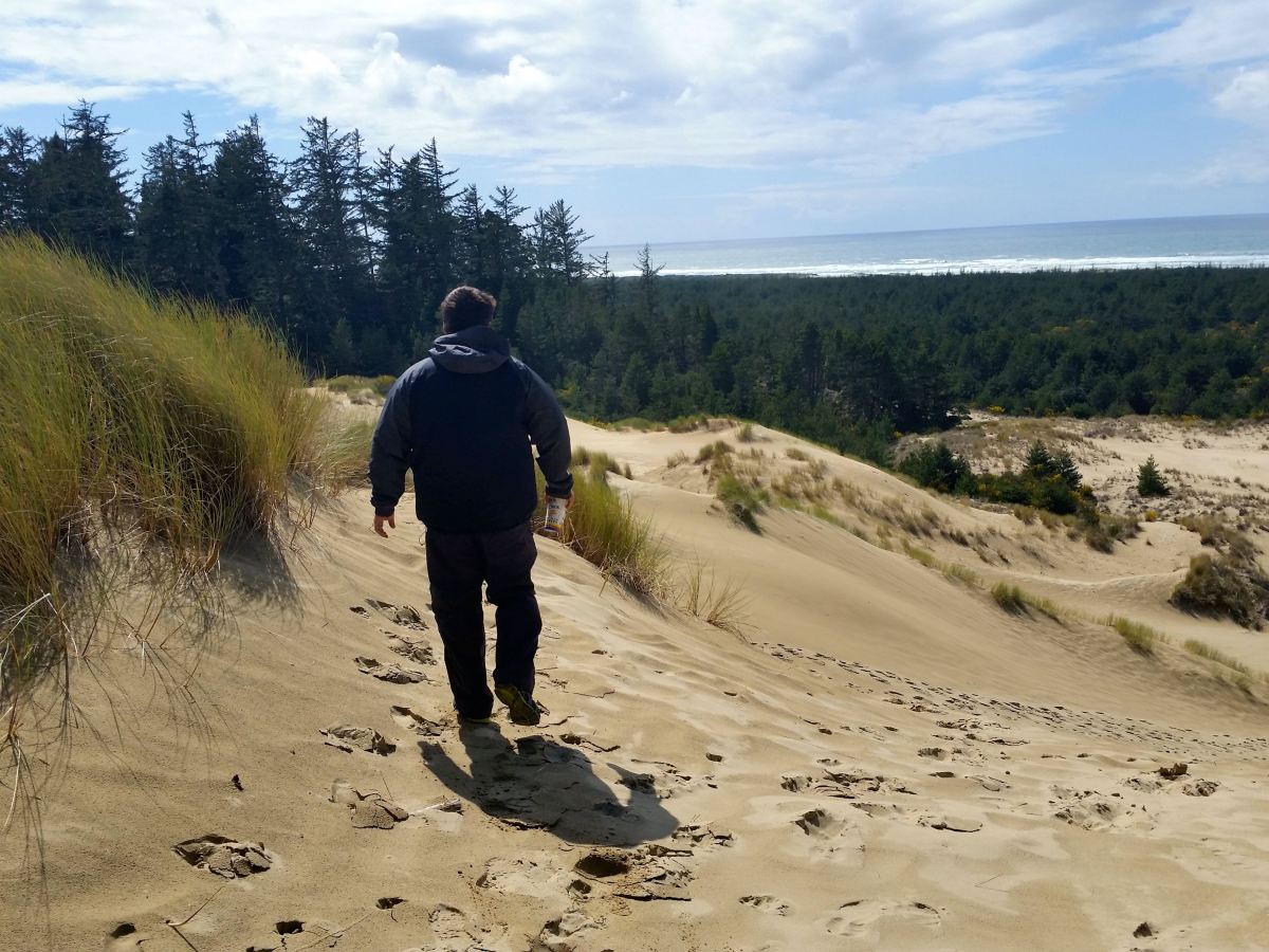 KC Walking Along the Sand Dunes Published April 21, 2015 at 3984 × 2988 Oregon Sand Dunes State Park This photo shows you the top of a sand dune up close with a forest and beach in the background. I love this photo because it looks similar to the cover of one of my favorite traveling books, “Vagabonding”.