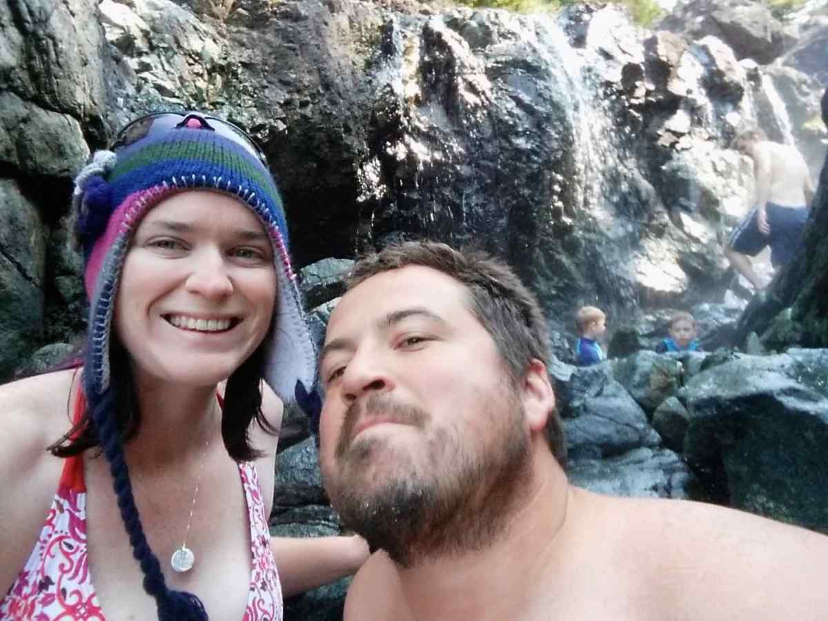 At the Hot Cove Hot Springs, near Tofino, British Columbia. It was about 40 degrees out, hence the beanie, but about 100 degrees in the water.