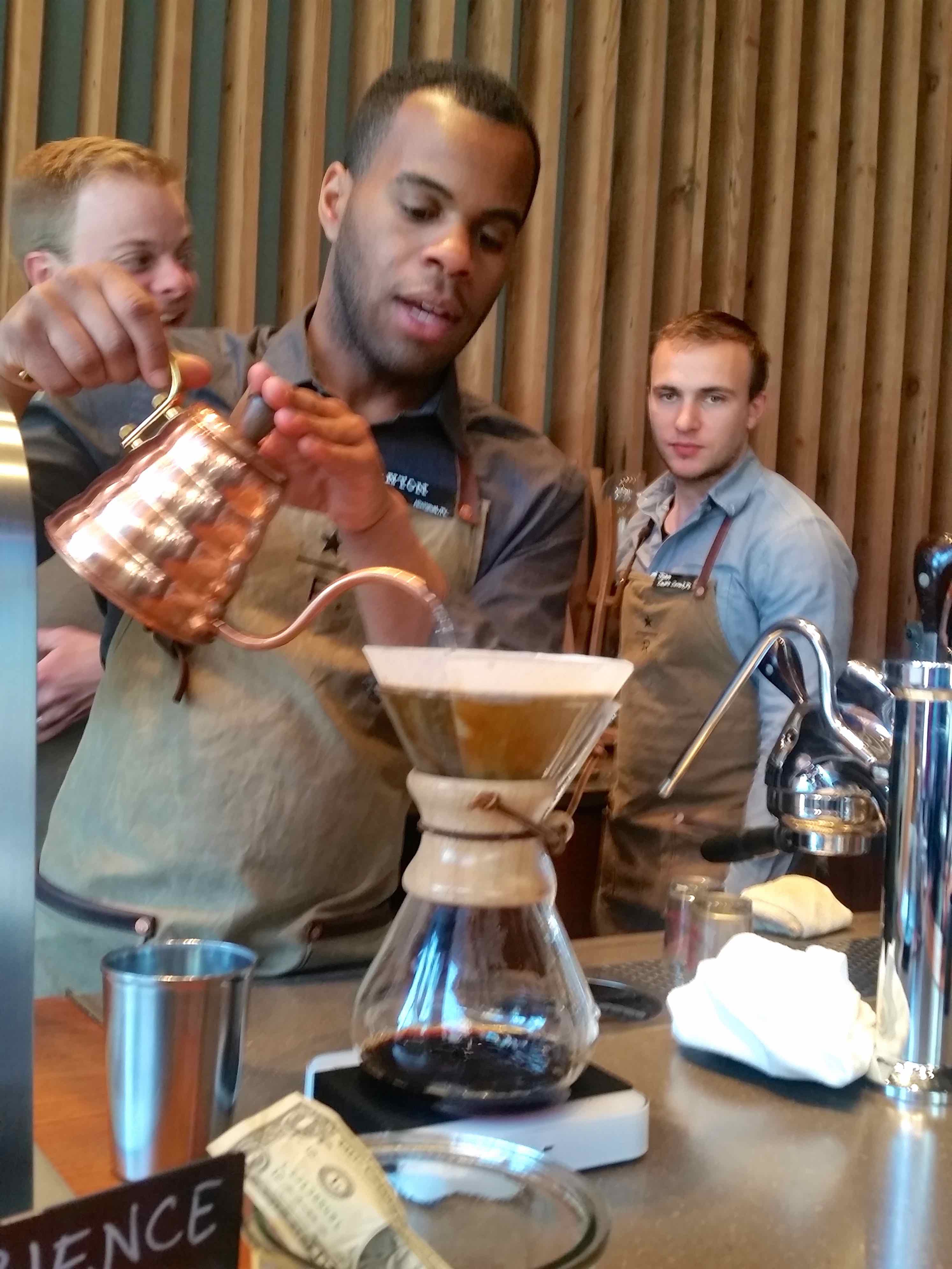 Brewing Published May 9, 2015 at 2988 × 3984 A barista shows us one method of coffee brewing I’m pretty sure the barista in the back didn’t approve of this picture. We had a fun discussion about water purification and the impact on coffee making.