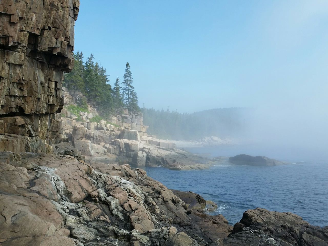 We got up at 5AM to pack up our camp and get some early morning climbs in at Otter Cliffs so that we can do some hiking later in the day and cross over to Canada. It was so worth it to get up early to climb the cliffs and watch the morning mists recede, revealing the rock beach shoreline.